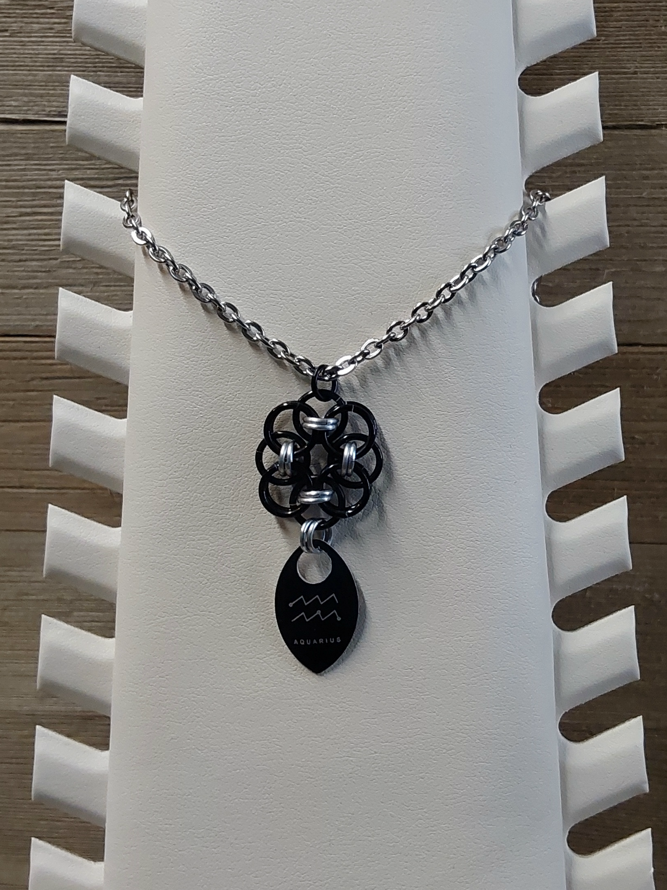 Introducing our captivating Helm Flower Onyx (Black) and Platinum (Silver) Zodiac Scale Necklace—a stunning way to showcase your zodiac sign with a touch of chainmaille artistry. Each necklace is meticulously crafted with a unique design that combines an etched scale featuring the constellation of your zodiac sign with the exquisite Helm Flower motif.