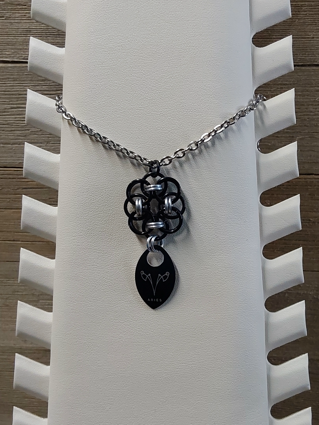 Introducing our captivating Helm Flower Onyx (Black) and Platinum (Silver) Zodiac Scale Necklace—a stunning way to showcase your zodiac sign with a touch of chainmaille artistry. Each necklace is meticulously crafted with a unique design that combines an etched scale featuring the constellation of your zodiac sign with the exquisite Helm Flower motif.