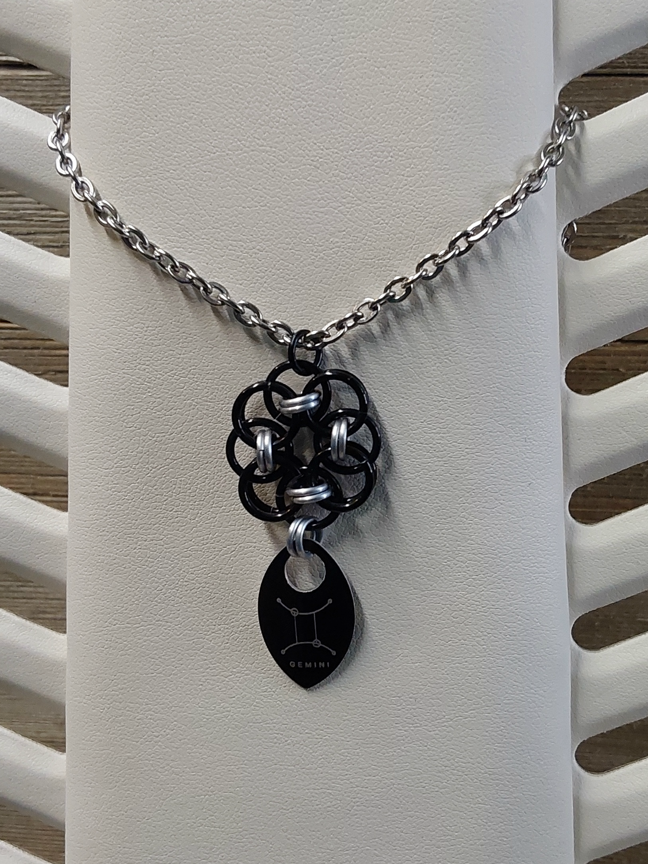 Introducing our captivating Helm Flower Onyx (Black) and Platinum (Silver) Zodiac Scale Necklace—a stunning way to showcase your zodiac sign with a touch of chainmaille artistry. Each necklace is meticulously crafted with a unique design that combines an etched scale featuring the constellation of your zodiac sign with the exquisite Helm Flower motif.