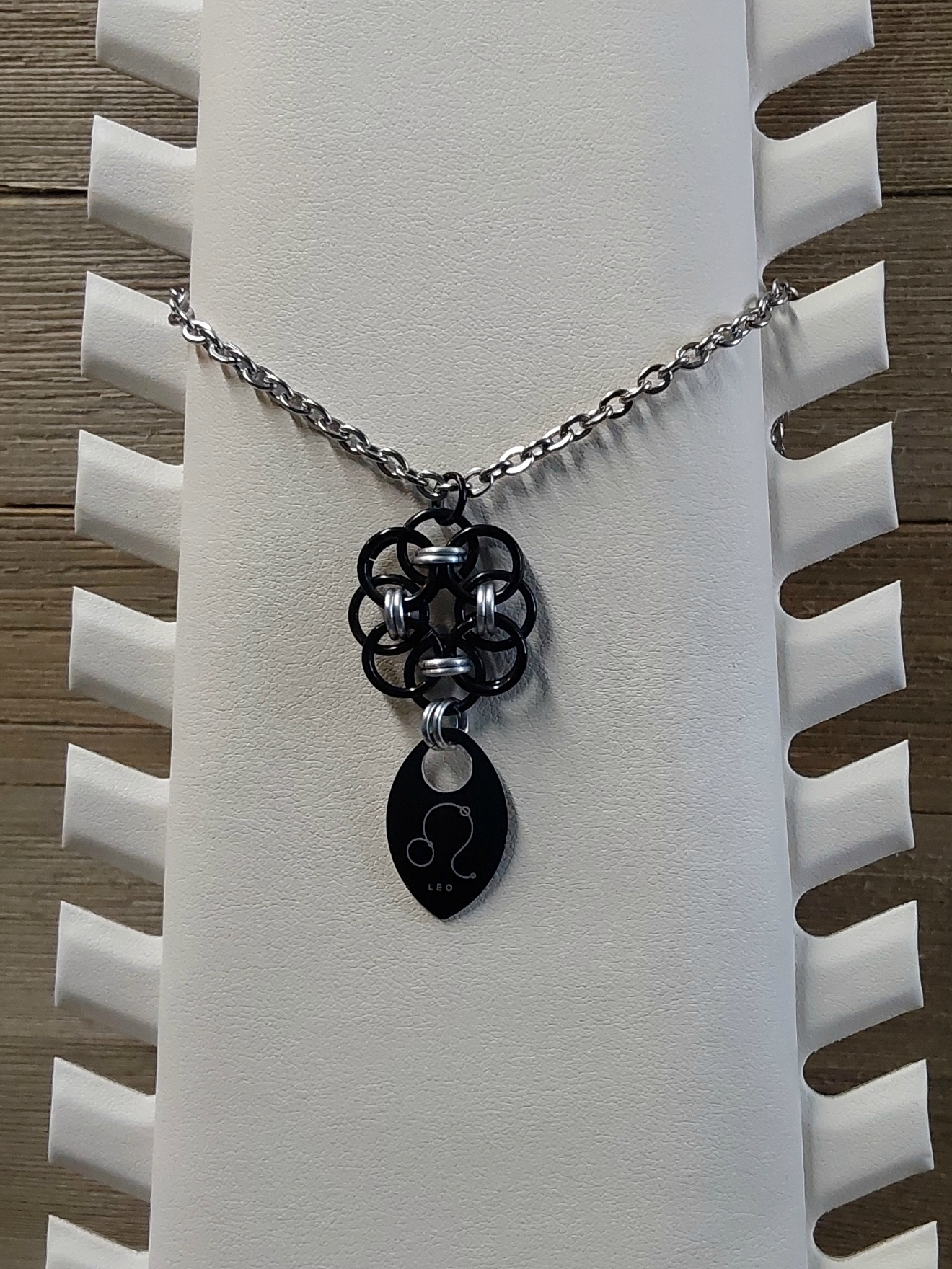 Introducing our captivating Helm Flower Onyx (Black) and Platinum (Silver) Zodiac Scale Necklace—a stunning way to showcase your zodiac sign with a touch of chainmaille artistry. Each necklace is meticulously crafted with a unique design that combines an etched scale featuring the constellation of your zodiac sign with the exquisite Helm Flower motif.
