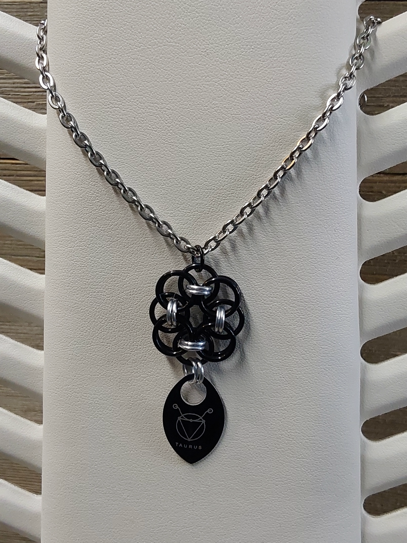Introducing our captivating Helm Flower Onyx (Black) and Platinum (Silver) Zodiac Scale Necklace—a stunning way to showcase your zodiac sign with a touch of chainmaille artistry. Each necklace is meticulously crafted with a unique design that combines an etched scale featuring the constellation of your zodiac sign with the exquisite Helm Flower motif.
