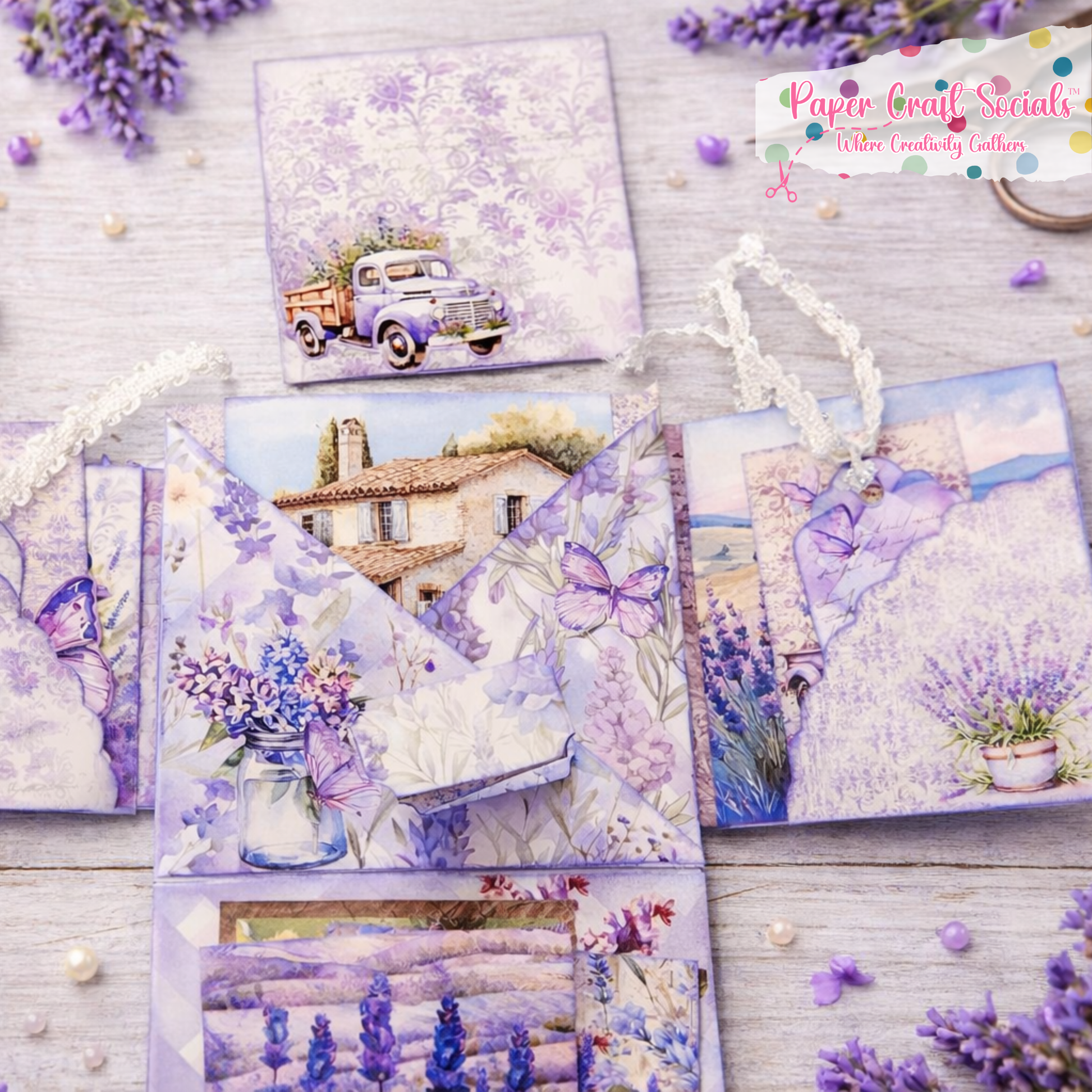This beautifully designed flip folio is filled with dreamy lavender artwork, butterflies, and vintage-inspired paper layers that make it perfect for memory keeping and creative storytelling.